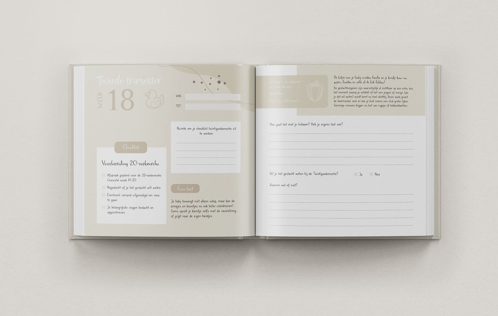 Het boek is overzichtelijk opgebouwd per trimester, zodat je duidelijk ziet hoe je zwangerschap zich ontwikkelt. Elk trimester bevat aangepaste vragen, weetjes en invulmomenten die passen bij die fase van je zwangerschap.