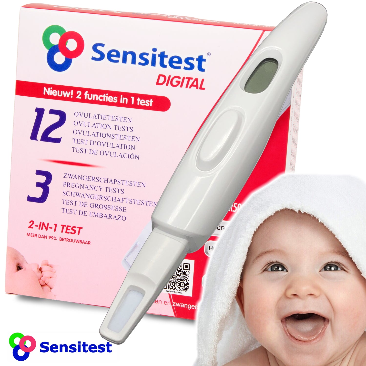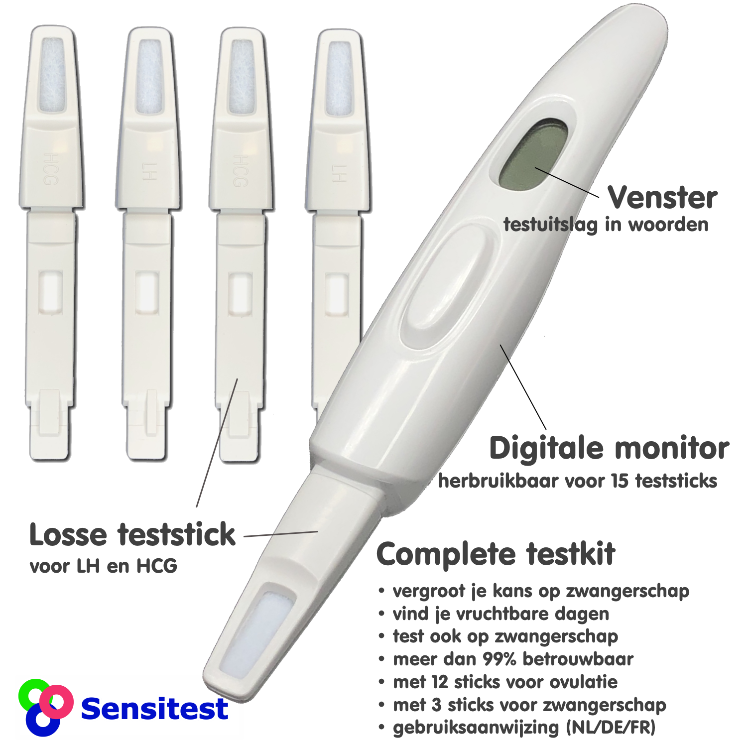 Dit is de nieuwe 2024 digitale ovulatietest van Sensitest. Wil je graag zwanger worden, kies dan dit gemakkelijke Sensitest voordeelpakket met 12 digitale ovulatietesten en 3 digitale zwangerschapstesten. Een geheel nieuw en verbeterd model voor 2024 met 2 functies in 1 digitale test. Als je geen streepjes wilt vergelijken op ovulatietesten of zwangerschapstesten, is de digitale test de oplossing. Op een klein LCD schermpje wordt de testuitslag weergegeven in woorden. Zonder enige twijfel weet je of je vruchtbaar bent en wanneer je de grootste kans hebt om zwanger te worden. Uniek aan deze digitale test is dat je met dezelfde monitor, niet alleen een ovulatietest maar ook je zwangerschapstest kunt uitvoeren. Dat bespaart veel ongewenst elektronisch afval ten opzichte van andere digitale testen.